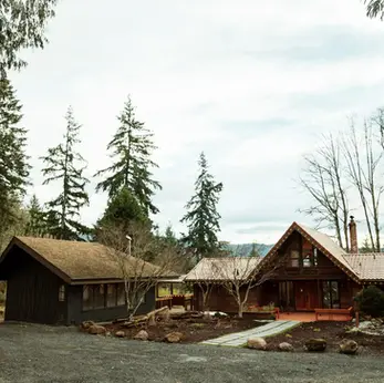 This gorgeous retreat home is situated on 40 acres of forest that overlooks the Columbia River Gorge in Washington. There are on-site walking and hiking trails, a hot tub, a large deck overlooking a mediation circle, and spring fed ponds throughout the property. It's a nature lover's dream, a space for rest, adventure, and reflection. With no neighbors in sight, you can enjoy the quiet of the forest in this expansive part of the PNW.
